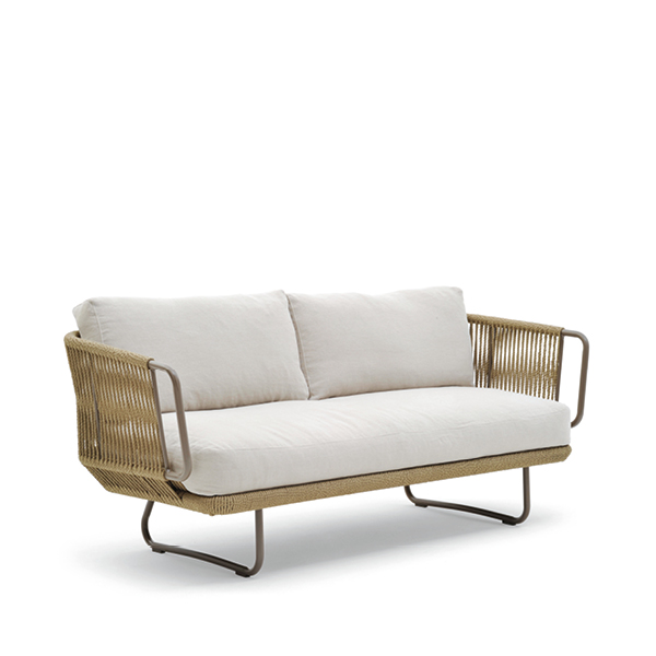Le canapé Babylon repose sur une structure en aluminium verni habillée d’un tressage régulier en corde synthétique, créant une assise généreuse et élégante pour les espaces extérieurs contemporains.